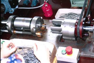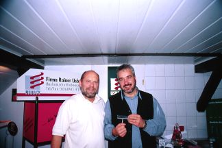 Rainer Usbeck presents a display of various steps in the worm manufacturing process to Klaus Pumpenmeier. Klaus "discovered" many old corkscrews and manufacturing plants in Steinbach-Hallenberg and arranged visits to several locations.