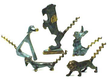 Don: Thank you for sending the picture. I agree with you that the figure does look somewhat like one of those Egyptian Godlike figures. Dog was one of my first thoughts when I first got one several years ago. Then I said "Nope, this one has a mane - it's a lion." I took a picture of my lion with four other pieces that are apparently from the same manufacturer. The dog at top left and the donkey at top right are both marked Made in Israel. The Dachsund and the lion are not marked (not much space) but have the same verdigris finish and the same worm. They are interesting decorative corkscrew for the backbar but not very practical in cork removal.
