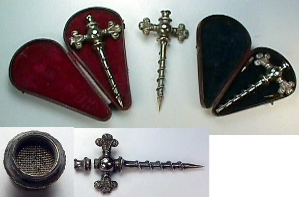 3. The third example is silver plated brass 4" long and has two detachable tips or points in a fitted case. The point or tip falls into the bottle when the helix passes through the cork into the interior to allow the passage of liquid into the hollow shaft. They are often missing as they were left in the bottle and forgotten or misplaced.