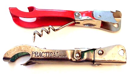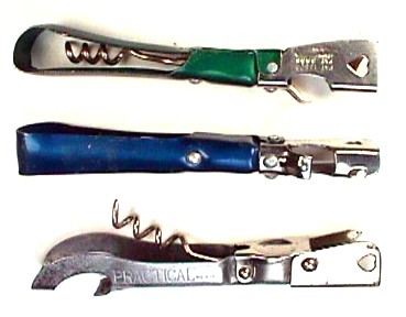 I also have two other similar sized but lighter in construction examples (green & blue) with a similar can opener and heart cutout but with the crown cap lifter formed in the can opener portion. The wire helix folds out from the side of the painted handle not the bottom like the PRACTICAL. Both are marked PAT 13505 PAT 3535 STAINLESS STEEL with the green example also marked JAPAN. I should think the Practical is also Japanese with the patent numbers on both items as the designs were possibly patented in Japan or perhaps added to make it more desirable in the marketplace.