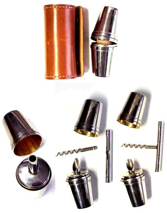 July 4, 2002, Ron MacLean writes: Here's a Russian corkscrew I found last Sunday morning. It is 2 5/8 inches long made of steel with the caplifter welded in place. The worm stores in the tube and locks in place in the tube with a slotted opening. The worm can fall out of the storage space if not careful.Don: The Russian picnic is a great find and interesting comparison to the corkscrew in my German cup / pourer / corkscrew set. The worm stores in the tube and is secured inside the pourer, then the four cups surround it and are placed in the fitted leather case. Each cup is marked MADE IN GERMANY U. S. ZONE. Here's a picture: