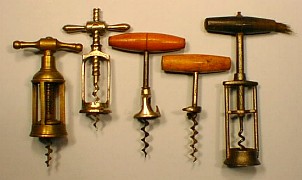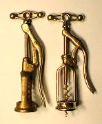| At left is an Italian brass four poster. 2nd is a rollover frame type distinctly marked R MURPHY BOSTON. 3rd is Murphy's Patent of April 23, 1901 (marked PAT APR 23 01 R MURPHY) for a self-puller variation with crown cap lifter. 4th is marked on the shank H BOKER & CO GERMANY. And...Coney & Co's 1854 English patented steel two-pillar corkscrew. | ![]() |