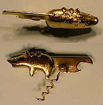 | The pig with corkscrew and cap lifter is a August 16, 1949 Design Patent by Howard L. Ross of Connecticut, USA. I owned the red and black examples. The yellow pig is from New Jersey. | ![]() |