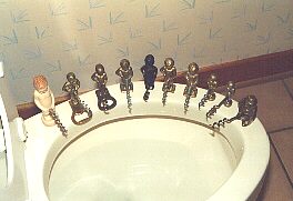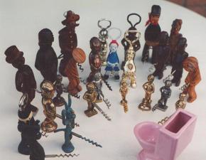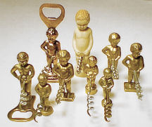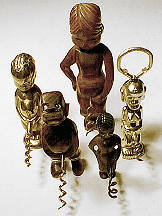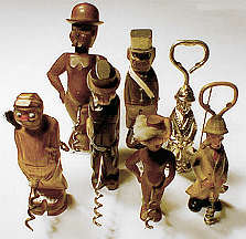![]() There are many imitations of the Mannekin Pis corkscrew including these African looking variations. When the head is removed from the tall one in the back, a cap lifter is exposed. Although most of these also appear to be left-handed, some hold their worms with both hands. |