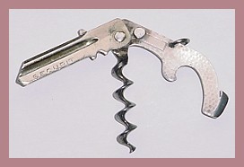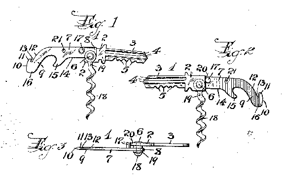 On Feb. 23, 1926, Robert J. McLean of New York City was granted U. S. Patent Number 1,574,497 for his "Combination Tool." The patent was assigned to Sloan & Company, a New York corporation. McLean's claims relate to the pivoting segments which lock in place by contacting a stop-pin and thus serve as the handle for "a helically formed member" (corkscrew). Although his invention discusses cap lifters, box openers, nail removers and key blanks, these are not part of his patent claims.