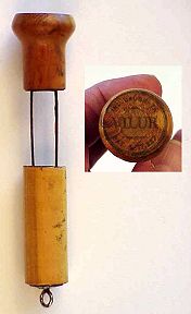 A prong puller in wood sleeve with hanging ring. Top of wood handle is marked IND. URUGUAYA VILUR PAT. 17,227. |