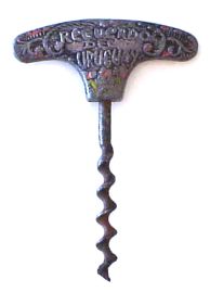 Direct pull corkscrew with cast handle marked RECUERDA DEL URUGUAY (Souvenir of Uruguay). |