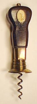 Ben first contacted me on January 5, 1997. He had seen a photo of a Can Can legs corkscrew in Traditional Home magazine and inquired of my interest in it. Little did we know that it would result in a commission for a portrait on the occasion of my 25th employment anniversary with Goodway Technologies. Our first obstacle to overcome was the thought of a traditional portrait with a serious looking person simply sitting in a chair or standing at attention. We agreed that we needed some action and what could be more appropriate than a bottle of wine and a corkscrew. It has been a lot of fun working with Ben on the portrait for the past year. The unfinished portrait was made available for my retirement party. It will now go back to Wisconsin for some finishing touches. I'll post the final version on this page when available...... The finished portrait arrived January 20, 1998. Do you know what is in my hand - it is pictured at right above? It is the only one known and it is Read's Coaxer. Marked READ'S COAXER 4 PARLIAMENT ST. Wood handle mounted on brass. Ivory plaque with crest inlaid in handle. Thomas Read was a cutler in Dublin in the 18th century. This corkscrew is c. 1790. Previous owners: Ted Weinberg and Leon Stark |