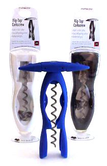 Metrokane's Velvet (left) and Flip-Top (right) corkscrews are essentially the same design. The Flip-Top has handles that flip up and down for use and storage. Both have very convenient two blade foil cutters built into both sides of the upper part of the contoured frame. A really great feature is the shape of the bottom portion of the frame. When the flexible legs are placed over the bottle neck, there are shoulders which rest on the top of the bottle. With the frame in place, the worm can be easily turned on center into the cork for smooth extraction. The rubberized grip gives both of these corkscrews a nice feel.