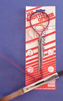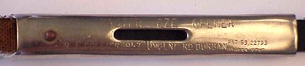 ![]() A combination jar wrench, tin opener, and corkscrew. The jar wrench is adjusted by moving the leather strap. Marked MASTER EZE OPENER. R.E.Collier 957 Umgeni Road Durban Pat 53 22793. |