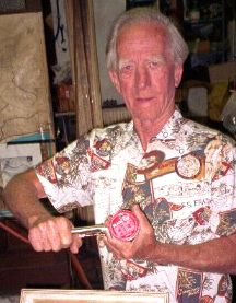 Collier demonstrates the jar wrench. After snugging up the leather strap on the jar top, an easy pull on the handle easily removes the most stubborn top. |