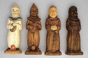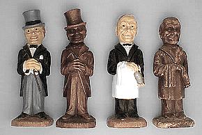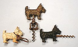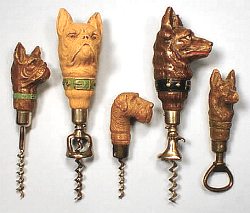 There are three types of Syroco corkscrews: Full figure with removable head to expose the corkscrew, head only and a full figure (Scotty dog only) with corkscrew attachment. Some of the figures were painted while others were stained with a walnut finish. All of the detachable heads could be purchased separately. The only full figures are the man with top hat, waiter, Indian, monk, clown, and knight. The collector should be cautious of other Syroco heads placed in these bodies or mismatched!