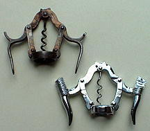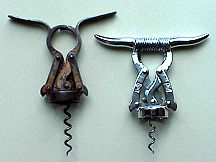 Compound Double LeversThe Compound Double Lever Corkscrews on the left is Englishman Heeley's "Empire." This was Heeley's 1890 patent being an improvement on his 1888 patent. It is marked on top of the handles THE "EMPIRE" J. HEELEY & SONS PATENT. The modern corkscrew is the Bull Pull. The packaging states "The Ultimate Corkscrew. The design of this beautifully crafted corkscrew was inspired by the original Empire Double-Lever." |
