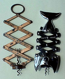 Lazy TongsThe father of the lazy tongs corkscrew was Marshall Wier. An abridged version of his 1884 patent specification reads "The screw is attached to a centre pin of the lowest pair of cross-bars of the lazy-tongs, and the ring, which passes over the bottle neck, is hinged to the side bars, suitable stops being provided to prevent lateral motion when the corkscrew is closed. A suitable handle is hinged at the other end of the lazy-tongs" On the left is the modern "Lazy Fish." |