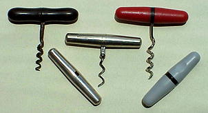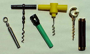 PicnicsA picnic corkscrew has a worm with a short shaft with a ring in the top. The worm is protected by a sheath which is inserted in the ring in the top to form the handle. It is a very convenient stowaway corkscrew for the picnic basket. The pair on the left are 19th Century and the pair in the middle are modern plastic picnics. Gucci sold a slightly different type of picnic. The sheath has a slot to accomodate the leg of the letter G. |