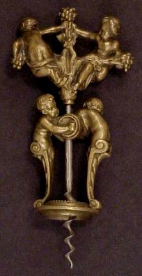 The two cherubs at the top are picking grapes from a vine and the two at the bottom are holding a cask. In his 1979 book Korkenzieher, Manfred Heckmann pictures this brass corkscrew and states that on December 1, 1976 it brought a record price for corkscrews at Christie's London of £1050 or over DM4000. Another was offered for sale by Sotheby's in London on May 29, 1985 and brought a record £4620. Sotheby's described it as a "19th century English style corkscrew."