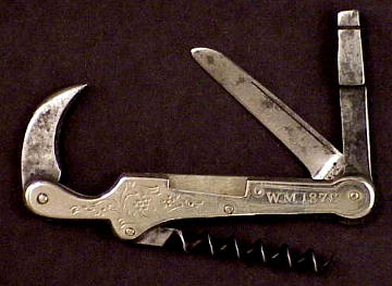 Sheffield Knife with a Corkscrew, Foil cutter, main blade and a coach Key produced by Ex Master Cutler M.Hunter & Son Sheffield (1880-1886 -Master Cutler in 1852). The knife is stamped "W. M. 1878."