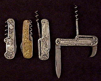 A simplified version of Carl Müller's 1896 German patent that has a pin mounted between the shoulders on the back of the knife. The shank of the worm slides under the pin and stops when its hooked end meets the pin. It is then swiveled on the pin and into position.