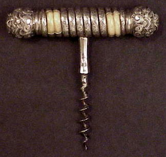 In 1886 Edward Thiéry and Charles Croselmire were granted an American patent for their "Article of jewelry and method of ornamenting the same." Designs were cut into the silver after it was electroplated to an object. Here is a magnificently decorated example of this art. The silver has been applied to an ivory handle with ornate floral design caps added to the end. There is fine detailing on all sections wrapping the handle and the silver is embossed with "Compliments Rochester Brewery" and a hand holding a glass of beer. It is from Rochester Brewery in Kansas City, Missouri. It is marked STERLING 5827 without a maker's mark. c.1900