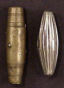 These two barrels are hinged and open like a clam to expose a double hinged worm. The upper part of the worm is held in place by a pin passing through one half of the clamshell. It is opened to unfold the worm and closed to use the barrel as the handle. On the right is an eighteenth century silver version.